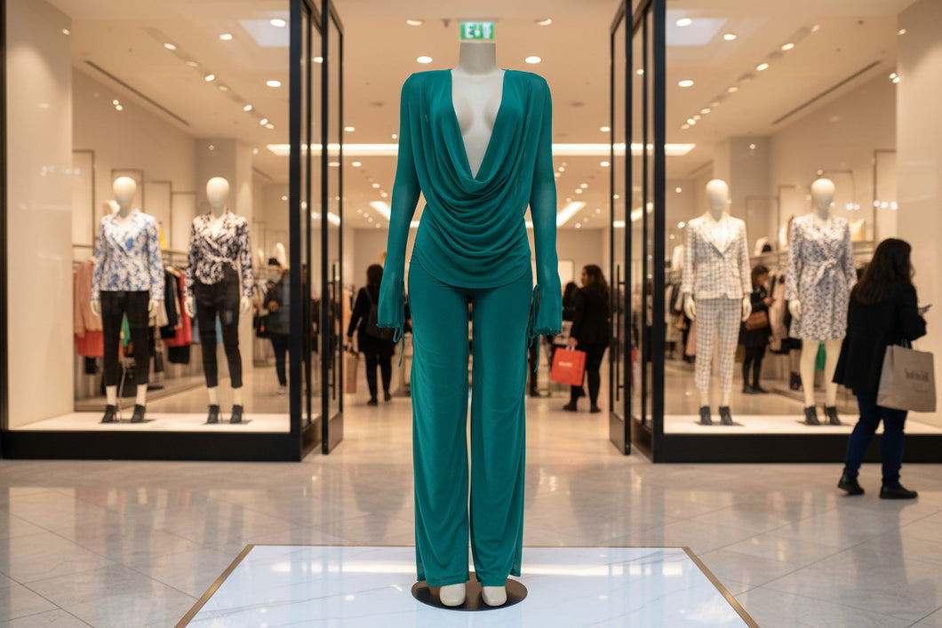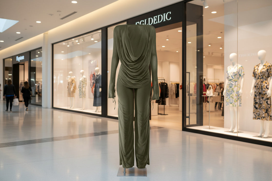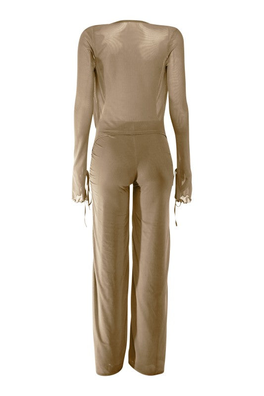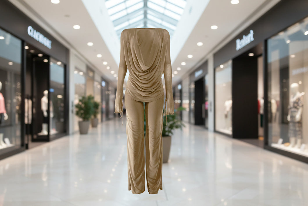 COWL NECK LONG SLEEVE SHEER TOP LINED PANT PULL ON ELASTIC WAIST STRETCH TALL GIRL FRIENDLY POLYESTER AND SPANDEX
