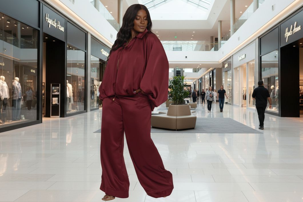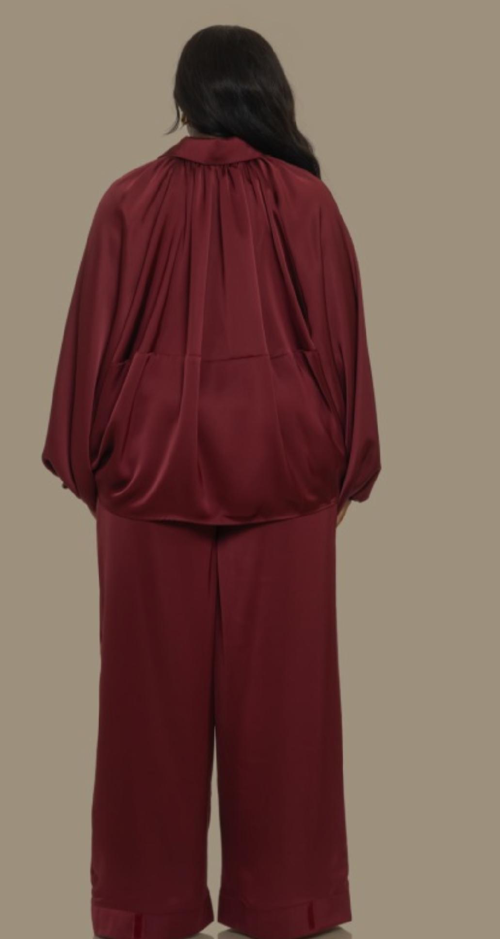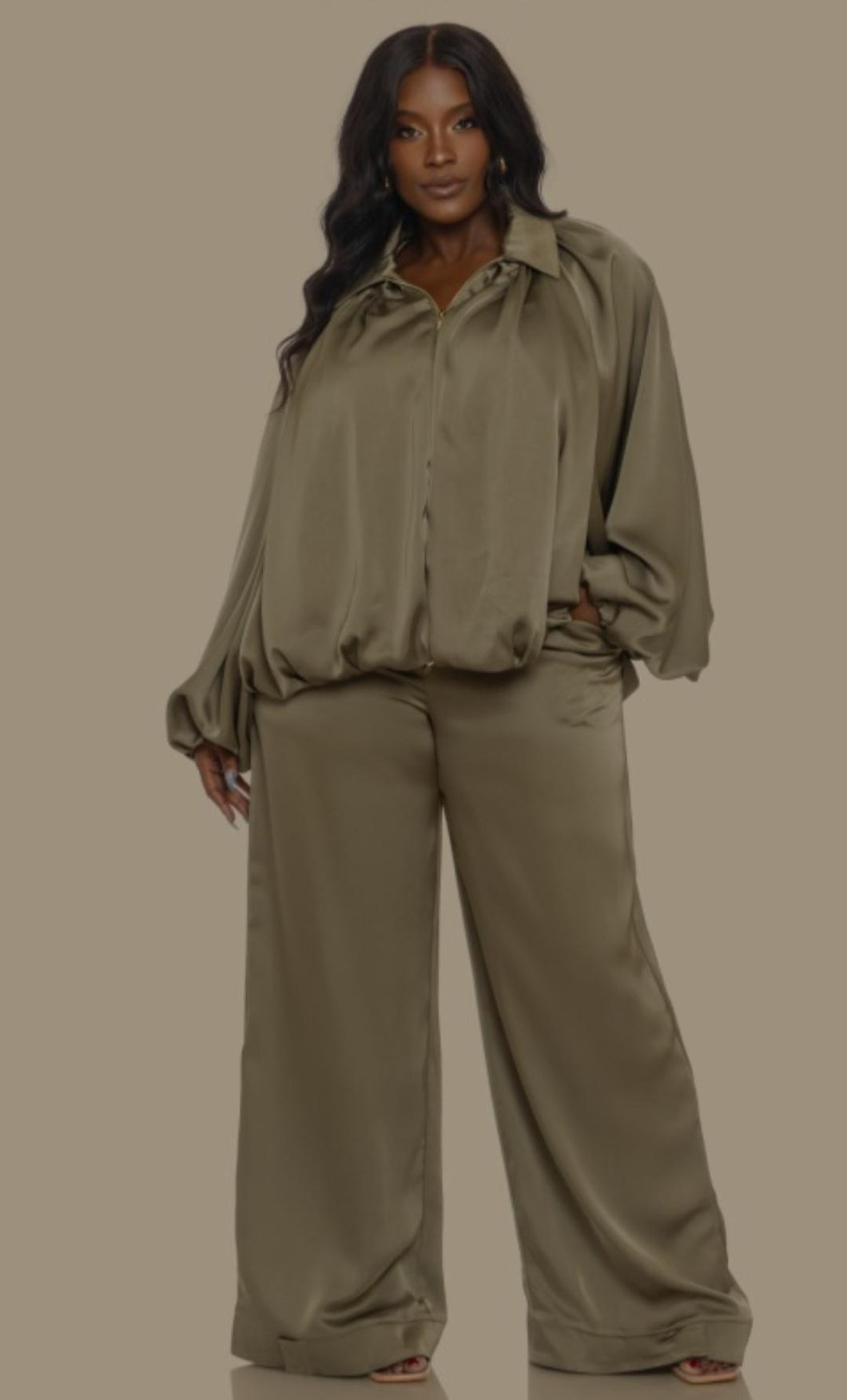 2pc set silky satin fabric dolman sleeves zip up high waisted pants adjustable Velcro pants hem true to size great fit tall girl friendly